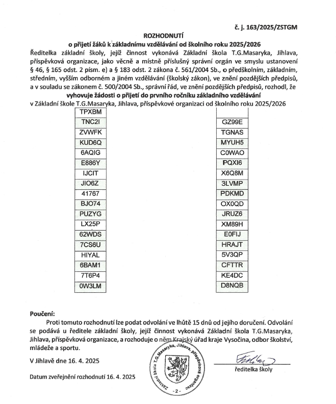 Rozhodnutí o přijetí - zápisy do 1. tříd