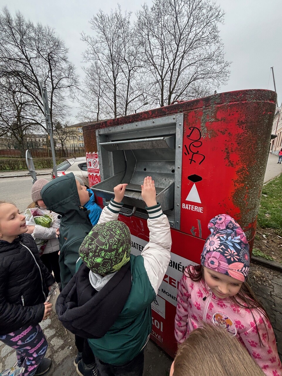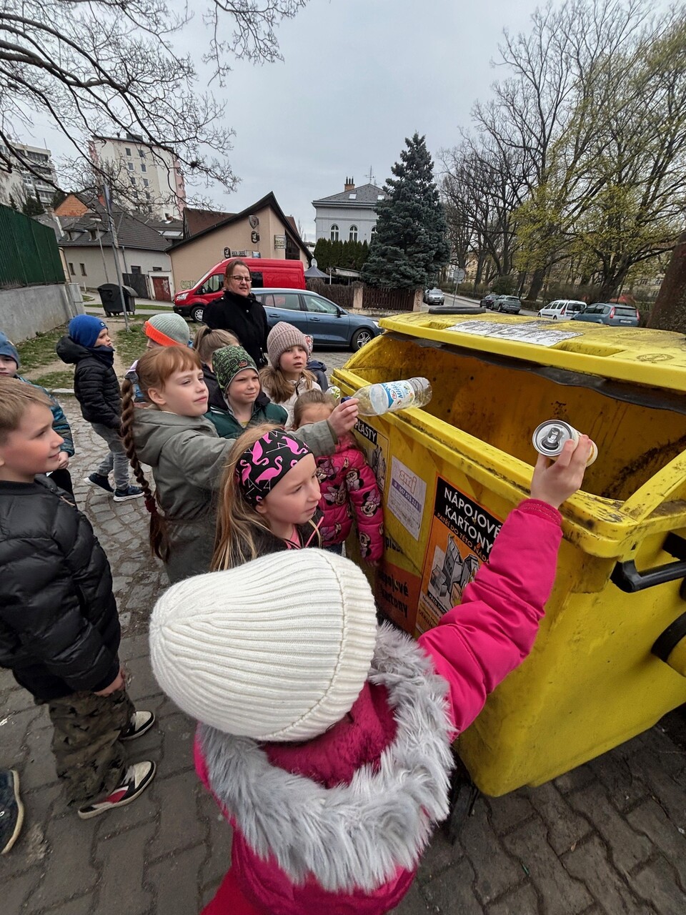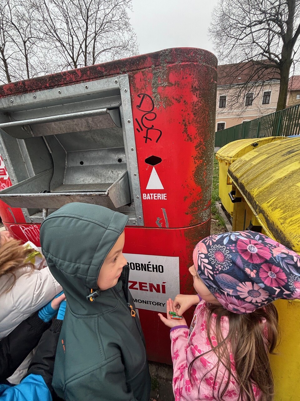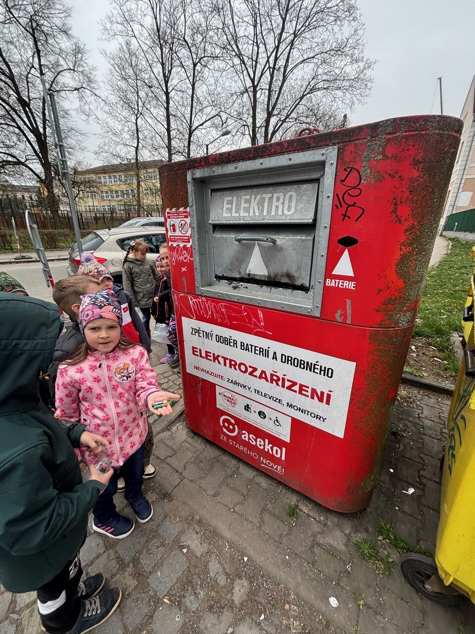 Prvňáčci se nyní ve škole učí, jak správně třídit odpad. Vyšli jsme tedy do ulic, abychom si to vyzkoušeli. Nesli jsme spoustu věcí – kávovou sedlinu, platíčko od léků, použitý rostlinný olej, trička, baterie, nabíječku apod. Cílem bylo najít nejbližší barevné kontejnery. Zjistili jsme, že jich je v ulicích opravdu hodně a většinu odpadu jsme vytřídili hned na začátku cesty. Trochu nás ale potrápil sběrný kontejner na textil. Naštěstí máme ve třídě děti, které si všímají, co se nachází v blízkosti školy a jejich bydliště a dovedli nás i k tomuto poslednímu (modrému) cíli.